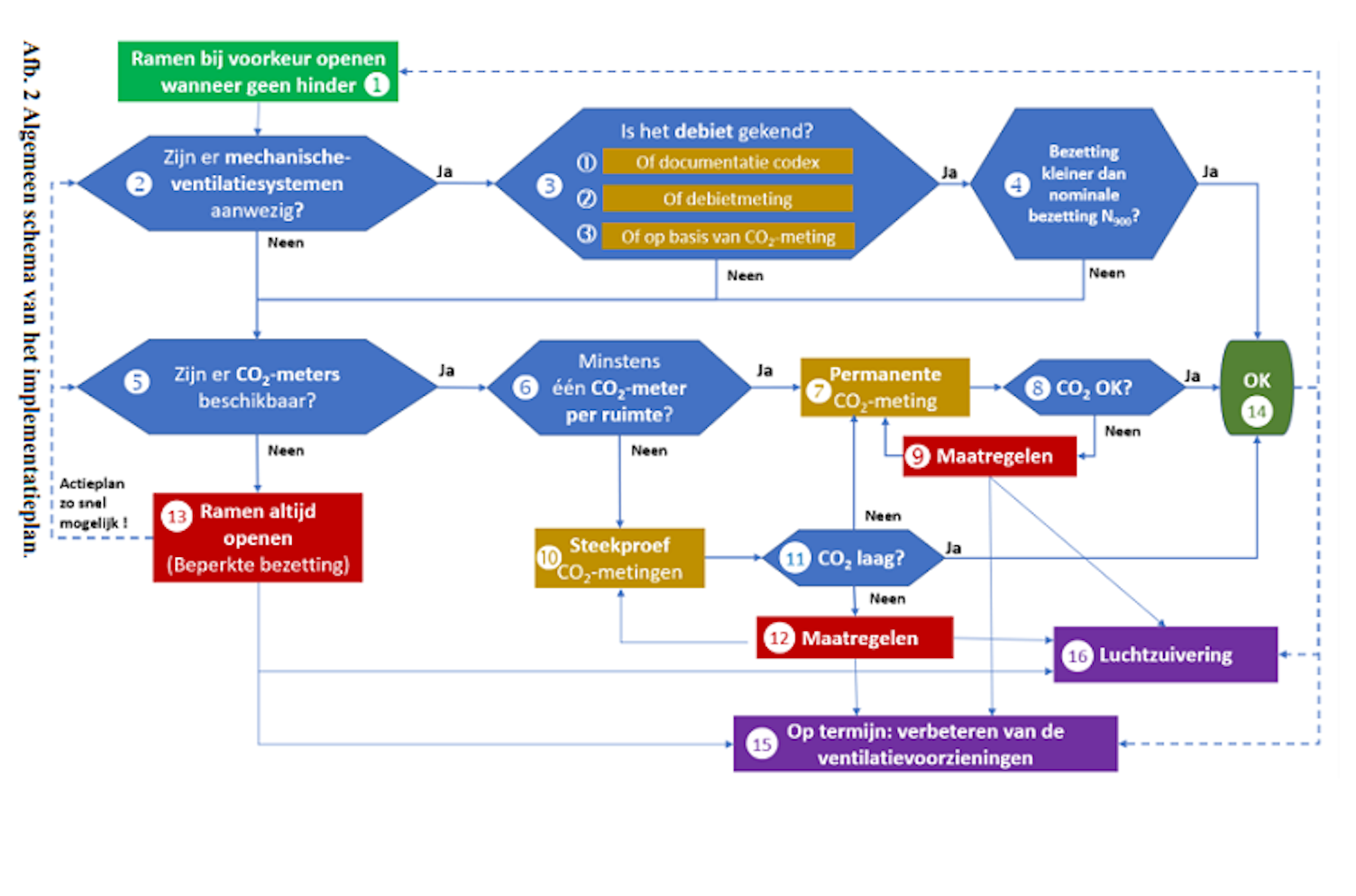 Om voldoende ventilatie in uw gebouw te organiseren heeft de ‘Task force Ventilatie’ van het Coronacommissariaat een implementatieplan opgesteld voor korte termijn maatregelen. Wilt u zelf alvast aan de slag met de ventilatie in uw gebouw? Hieronder ziet u het schema: